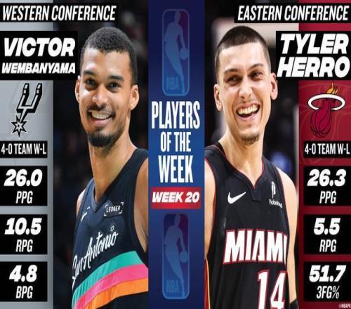 北京时间3月10日,NBA官方宣布,马刺中锋维克托-文班亚马和热火后卫泰勒-希罗被评为第20周的周最佳球员。