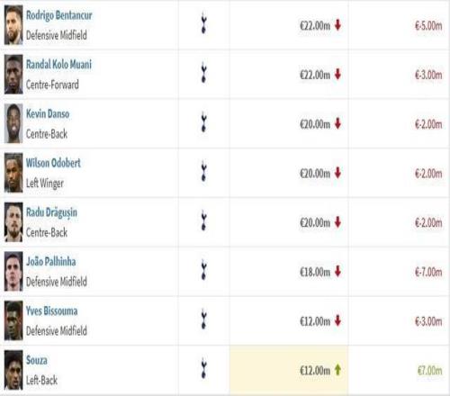 北京时间3月9日,德转更新了英超联赛球员的身价,热刺一共有17人身价有变化,其中16人下跌,罗梅罗、哈维-西蒙斯和库卢塞夫斯基均下跌1000万欧元,仅有小将索萨上涨了700万欧。