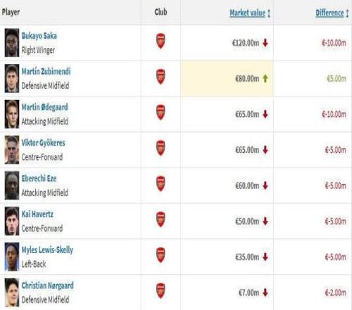 阿森纳球员身价变化: