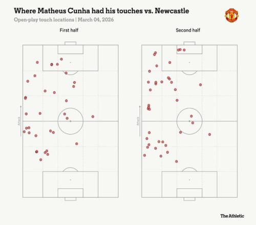 这与去年10月客战利物浦时形成鲜明对比。在安菲尔德,曼联在争抢高空球第一点、第二点时结构清晰,最终2-1取胜。而在圣詹姆斯公园,斗志昂扬的纽卡斯尔从一开始就掐断了曼联的所有快速推进。