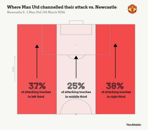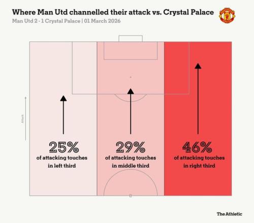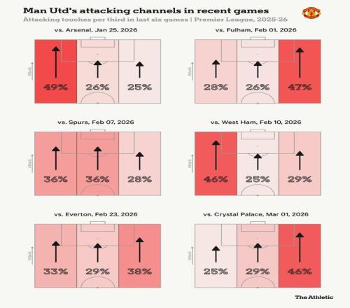 对阵水晶宫时,曼联在2025-26赛季左路进攻次数降至最低。