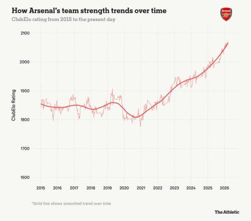 尽管并非完美无缺,但该系统目前将阿森纳评为世界最佳球队——鉴于他们本赛季在阿尔特塔执教下国内外赛场的表现,这个地位很难反驳。下图展示了自他执教以来球队的迅速崛起。