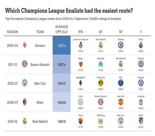 此外,皇家马德里2015-16赛季的夺冠之路被评为第五轻松的,他们在决赛中以4-1击败同城对手马德里竞技。他们晋级决赛的道路——不包括决赛本身——被评为最有利的,先后遇到了罗马、沃尔夫斯堡,以及在曼努埃尔-佩莱格里尼执教最后赛季、最终排名英超第四的曼城。