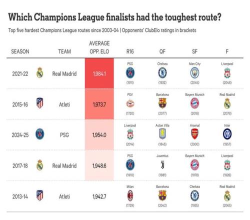 在所有参加过10次或以上16强比赛的球队中,根据对手的ClubElo评分,只有巴黎圣日耳曼平均遭遇的对手比阿森纳更强。