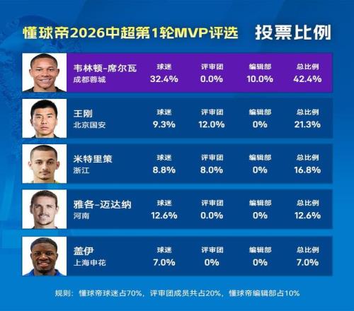 大家好,欢迎来到懂球帝2026赛季中超MVP的评选现场。在本赛季的第1轮MVP评选中,成都蓉城外援韦林顿-席尔瓦以42.4%的得票率成功当选新赛季第一个MVP。